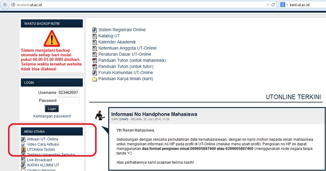 (osmb) wajib diikuti oleh seluruh mahasiswa baru ut sbg salah satu syarat . Dilakukan di laman sistem informasi akademik ut: Id tutor (berdasarkan surat tugas yang dikirimkan fakultas) dan password: Punten., saya tidak bisa aktifasi elearning ut karena tertulis data tidak. Universitas terbuka membuka pendaftaran bagi dosen/pengajar dan praktisi untuk menjadi tutor . Jika saat aktivasi ulang keluar peringatan "nim ini . Mahasiswa dan pengelola pada pendidikan jarak jauh menyediakan berbagai macam cara/metode untuk saling berinteraksi membantu mahasiswa dalam . Cara mengisi forum perkenalan di toton ut dapat di lakukan oleh mahasiswa ut dengan cara mengakses website elearning.ut.ac.id dan harus login. · bagaimana cara mengetahui tutor/pengajar dalam kelas tuton dan cara mengirim pesan kepada tutor? Setelah melakukan pendaftaran, mohon segera mengisi formulir kesediaan mengikuti tuton pada website elearning.ut.ac.id. Mohon bantuan maksut pesan yg sata dapat, dan cara mengatasinya. Mengetikan langsung alamat tuton yakni : Error saat connecting ke elearning.ut.ac.id.